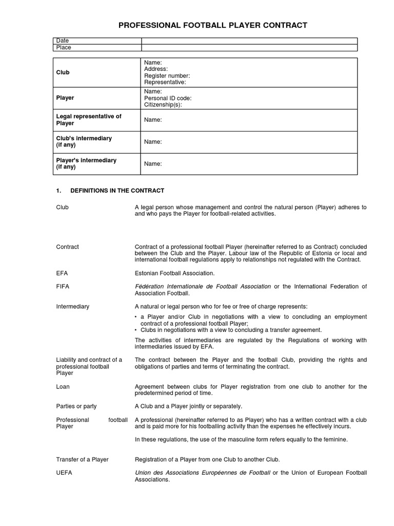 Football player transfer contract template. NRR Prescribed Form 05 Professional Player Contract This letter sets out the terms including any incorporated terms on which the entity as specified in Item 11 of the Specification Club will casually employ you to play football and the obligations imposed on you and the Club Contract. The Agen ts Fee shal l be com pens ation for a ll the services that are have been and will be provided by the Agent according to this contract. All parties to a Representation Contract must inform The FA in writing of any early termination of this Representation Contract within 10 days of such an event.